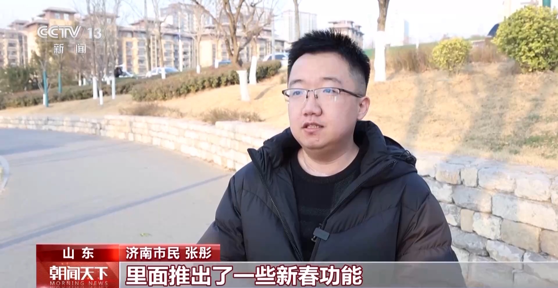济南市民 张彤:里面推出了一些新春功能,同唱一首歌。你一句我一句,我觉得还挺有意思的。据多家平台数据,今年春节期间,AI大模型的应用率正在持续上升。从除夕至今年大年初三,各大AI大模型的使用次数累计超100亿次。其中,有1.3亿人第一次使用AI帮助下单,近400万人为60岁以上用户,超40%的用户为“00后”。AI持续赋能 科技点亮新春除了AI大模型的应用,今年春节,越来越多的消费者选择购买“电子年货”回家过年。参观数字灯会、体验智能互动,感受传统年俗与前沿科技的深度融合,让这个新春增添了别样的科技暖意和新奇体验。春节期间,在深圳华强北,融合AI、AR等新技术的科技产品成为消费新宠。数据显示,近两个月,华强北销售前8名产品分别为:无人机、机器人、AI眼镜、AI玩具、AI手表等品类。这8类产品也成为市民游客新春送礼、自用的热门选择。